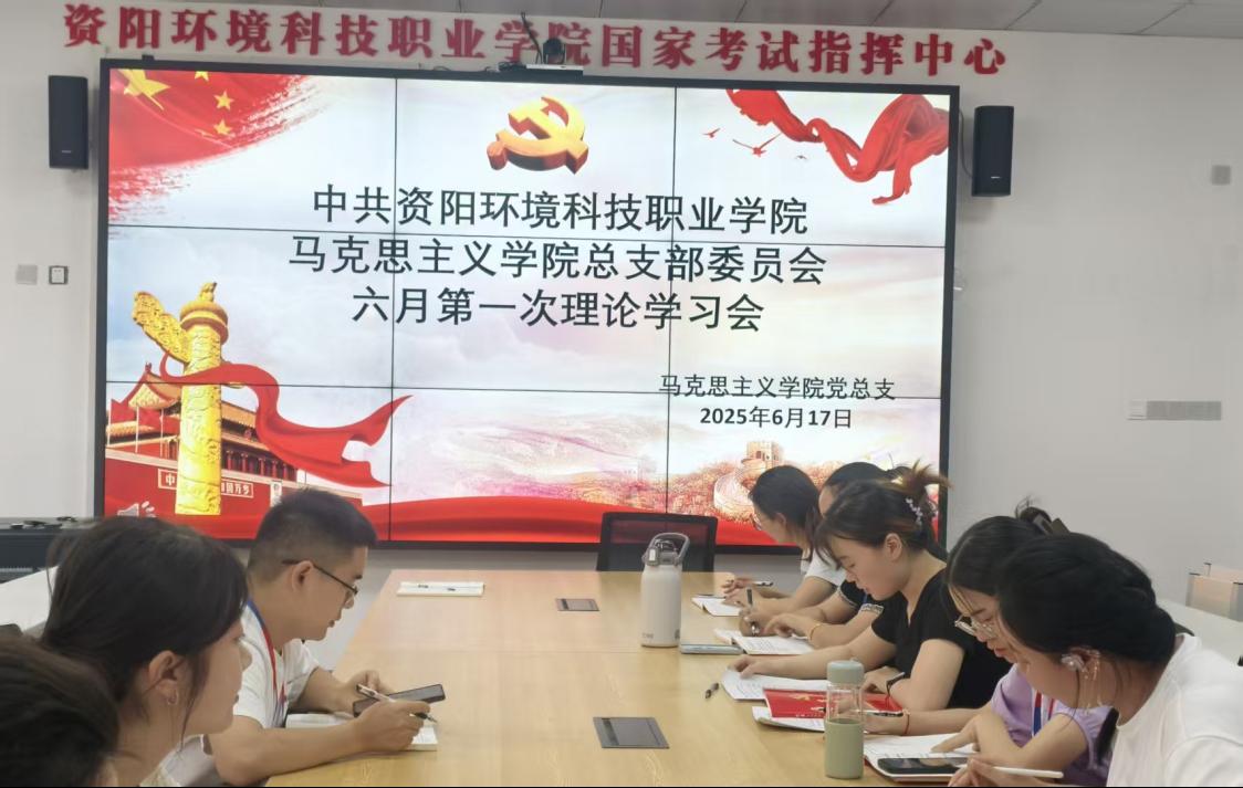 为深刻体会“人民”二字在习近平新时代中国特色社会主义思想中的重要意义、自信自立在习近平新时代中国特色社会主义思想中的自觉性、问题导向在习近平新时代中国特色社会主义思想中的源头活水作用、系统观念在习近平新时代中国特色社会主义思想中的基础性的思想和工作方法作用、习近平新时代中国特色社会主义思想胸怀天下的博大胸襟,2025年6月17日,资阳环境科技职业学院马克思主义学院党总支在B211开展六月第一次理论学习会。