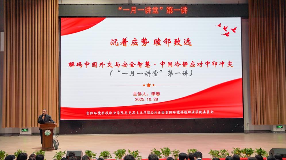 为厚植青年学生爱国主义情怀,提升学子国家安全意识与国际视野,2025年10月28 日下午,资阳环境科技职业学院 “一月一讲堂”爱国主义主题系列讲座第一场在 C101 教室顺利举行。本次活动由马克思主义学院与共青团资阳环境科技职业学院委员会联合主办,学生处副处长李春老师担任主讲人,以“中国冷静应对中印冲突” 为专题展开深入分享。