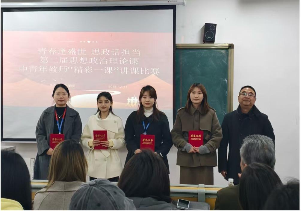 本次比赛首次引入学生评委机制,并创新采用“有生课堂”模式,真实还原教学场景。马克思主义学院院长李叔龙在赛后点评中充分肯定了参赛教师的精心准备与精彩表现,精准指出教学中的亮点与不足,并勉励全体思政课教师持续深耕教学,不断提升课堂育人实效。经评委组综合评定,司宇、李智潇、陈婷三位教师荣获一等奖,李丽莎、余建蓉、雷心怡、吴艾佼四位教师斩获特等奖。教务处副处长王俊槐、校长助理季辉分别为获奖教师颁发证书。