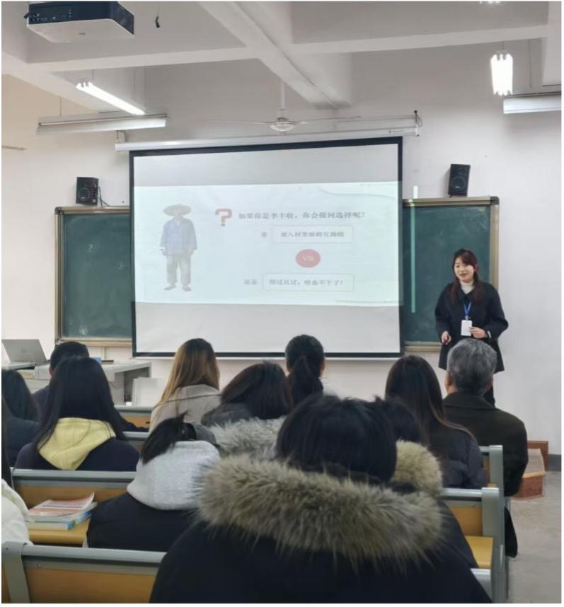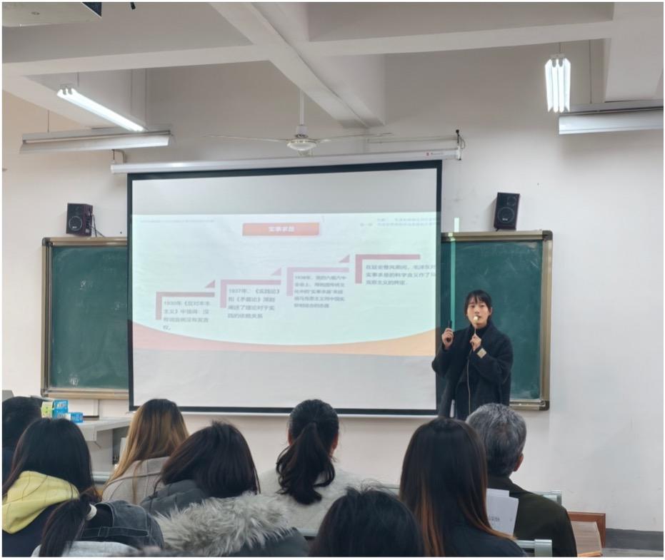 来自《毛泽东思想和中国特色社会主义理论体系概论》课程组的吴艾佼老师创设“李丰收的难题”情境,生动演绎了“农业的社会主义改造”的历史进程;陈婷老师从毛泽东题写“实事求是”墨宝切入,结合革命历史与大学生活阐释《实事求是》的实践价值。