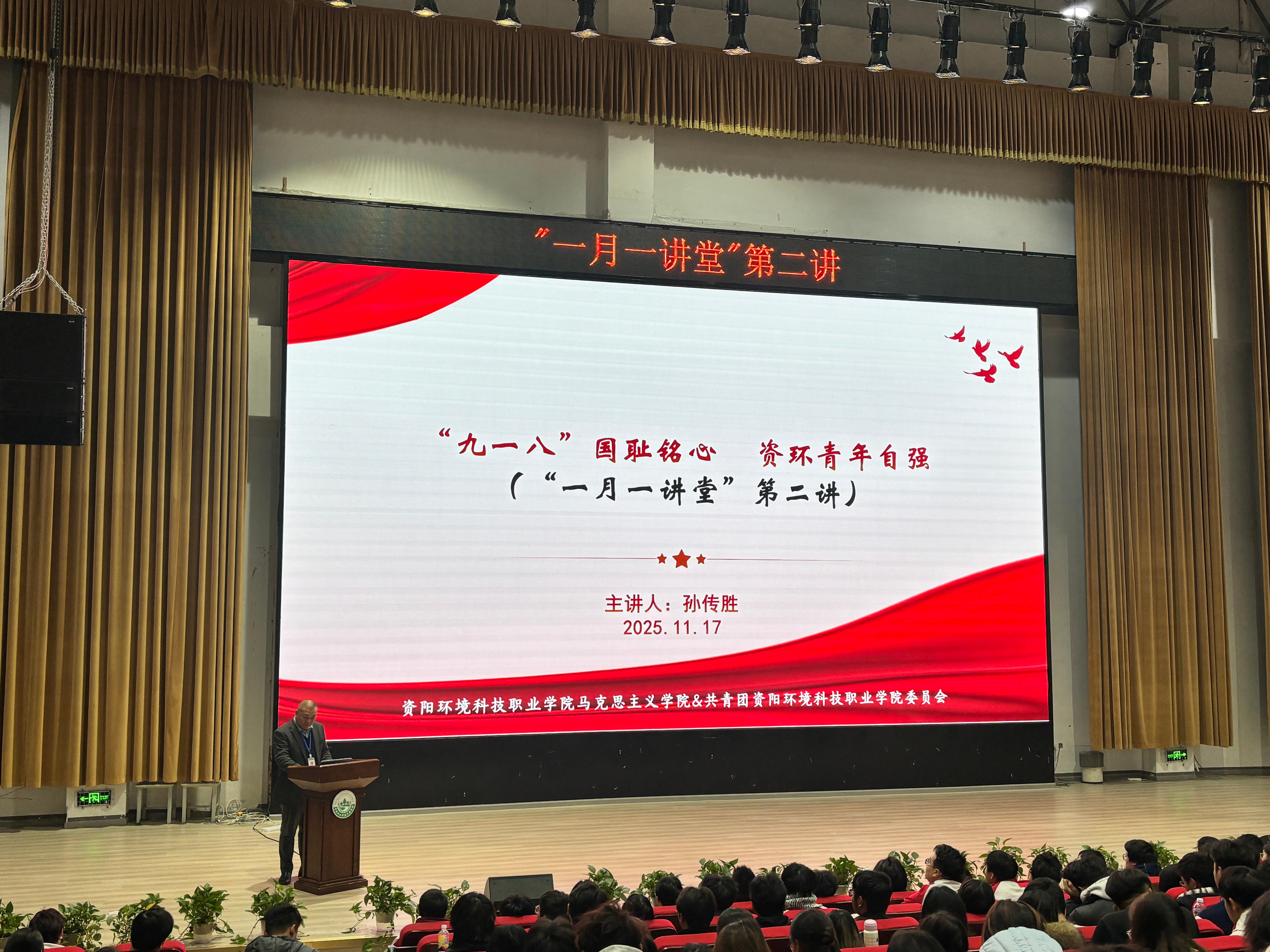 为传承红色基因,厚植家国情怀,引导青年学子以史为鉴、勇担使命,2025年11月17日,资阳环境科技职业学院马克思主义学院与共青团资阳环境科技职业学院委员会联合举办“一月一讲堂”系列讲座的第二场。本次讲座特邀学校生态环境学院党总支书记孙传胜担任主讲人,以“‘九一八’国耻铭心,资环青年自强”为主题,带领师生重温历史,凝聚自强奋进的青春力量。